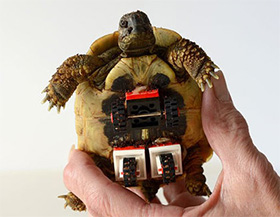 亀が歩けるように車輪を体に取り付けた。